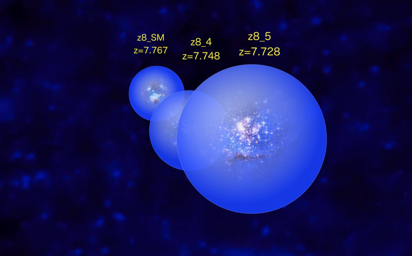 Once identified, the distances and hence the ages of these galaxies were confirmed with spectra taken with the MOSFIRE spectrograph at the Keck I telescope at the W. M. Keck Observatory on Maunakea in Hawai'i. All three galaxies show strong emission lines of hydrogen Lyman alpha at a redshift (z = 7.7), which means we are seeing them at about 680 million years after the Big Bang. The size of the ionized bubble around each was derived from computer modeling. These bubbles overlap spatially, but are large enough (about 2.2 million light-years) that Lyman alpha photons are redshifted before they reach the boundary of the bubble and can thus escape unscathed, allowing astronomers to detect them.