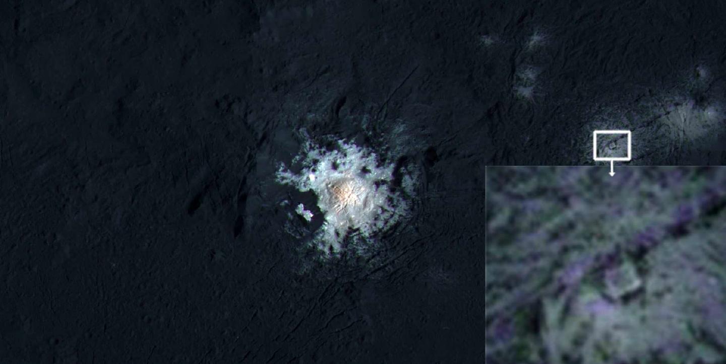 image: Inside the Occator crater of the dwarf planet Ceres appears a strange structure, looking like a square inside a triangle.