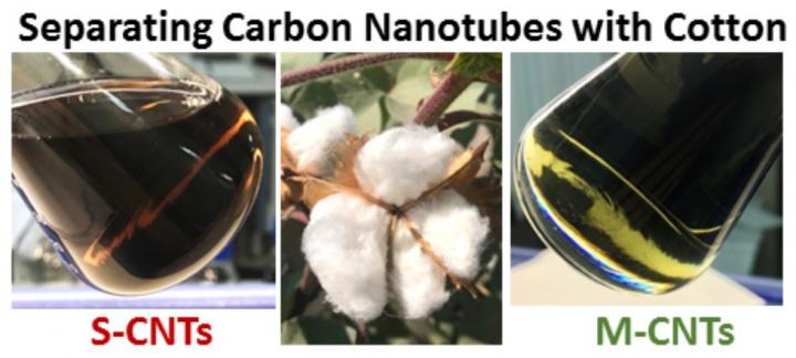 One of the existing methods of separation, referred to as selective gel permeation, in its essence is a basic column chromatography. Namely, the CNTs surfactant solution is passed through a column, filled with beaded gels of agarose and/or dextran with the trade names "Sepharose" and "Sephacryl". Both agarose and dextran are polysaccharides made from the glucose or glucose-like building units. Cellulose is a natural polysaccharide consisting of the same structural units. This is why the team decided to try this material as a column filler for selective permeation. Cotton is natural cellulose, possessing high surface area due to the fibrous structure. Co-author Timur Khamidullin, a PhD student in Ayrat Dimiev's group (Laboratory of Advanced Carbon Nanomaterials, Kazan Federal University) made the first try with natural cotton wool purchased at a local pharmacy. Despite low sorting efficiency, there was some registered separation, i.e. cotton worked as a column filler. Inspired by the result, Ayrat Dimiev decided to chemically modify the cotton wool to change the chemical nature of its surface. Results were even higher that the expectations: this gave much better separating efficiency from the first very trial. It took another year and half of the collective group efforts to fine-tune both chemical modification of cotton, and the surfactants' ratio in dispersing and eluting solutions.