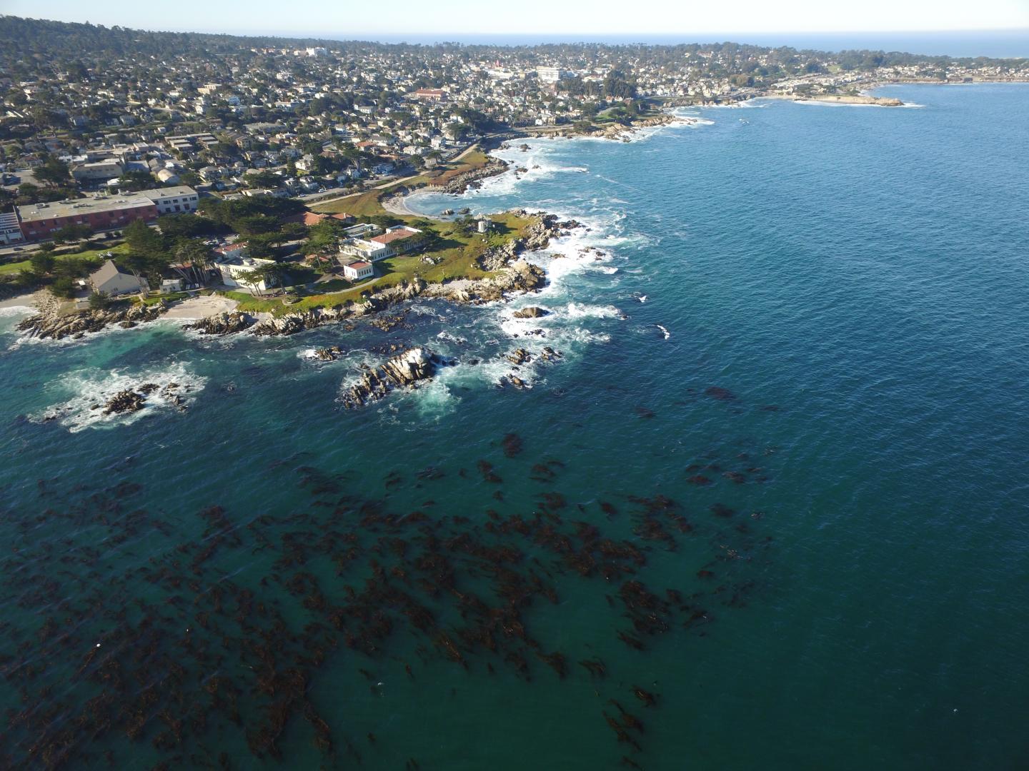 image: Aerial drone photo of the kelp forest canopy on the protected side of Cabrillo Point. Hopkins Marine Station is on the point in the upper left corner. (Image credit: Heidi Hirsh)