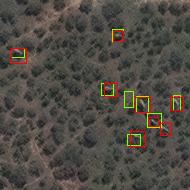 image: Elephants in woodland as seen from space. Green rectangles show elephants detected by the algorithm, red rectangles show elephants verified by humans.