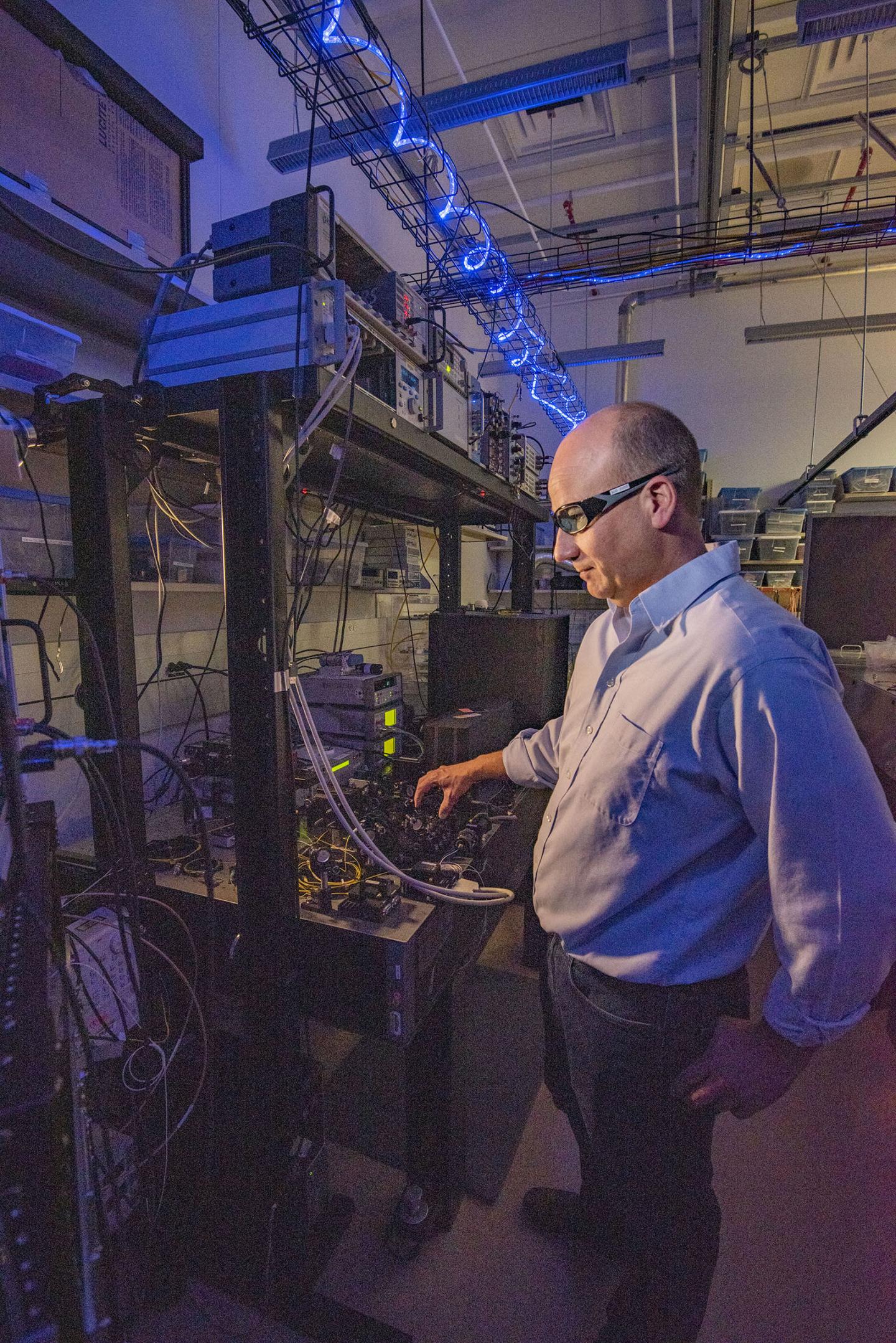 image: As part of a research project to help establish standards for photon-counting detectors, NIST physicist Thomas Gerrits adjusts the laser beam hitting a detector. The squiggly overhead light helps researchers see the lab setup without disturbing the detectors, which are insensitive to blue light.