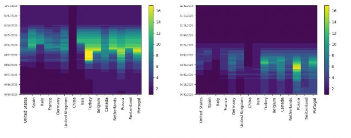 image: LEFT: Heat maps track the changing cluster membership of the fifteen most severely impacted countries with respect to numbers of COVID-19 cases. Cluster membership depicts COVID-19 severity relative to the rest of the world. Clusters are ordered with 1 being the worst impacted at any time. Darker and lighter colors correspond to smaller and greater numbered cluster labels and represent worse and less affected clusters, respectively.