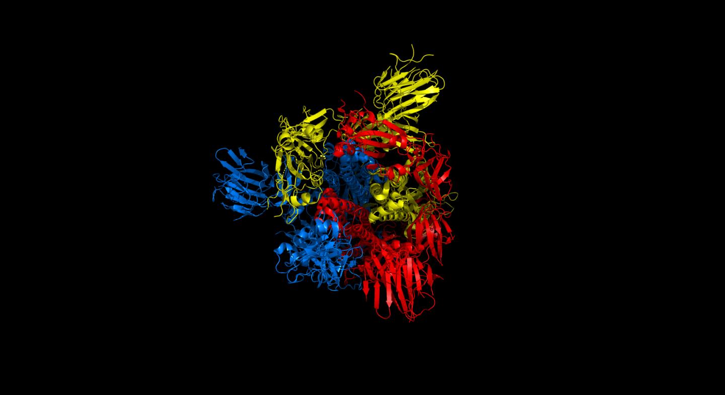 image: Top view of spike protein structure 6vyb. Colors blue, red and yellow denote the 3 sub-parts of the homodimer.