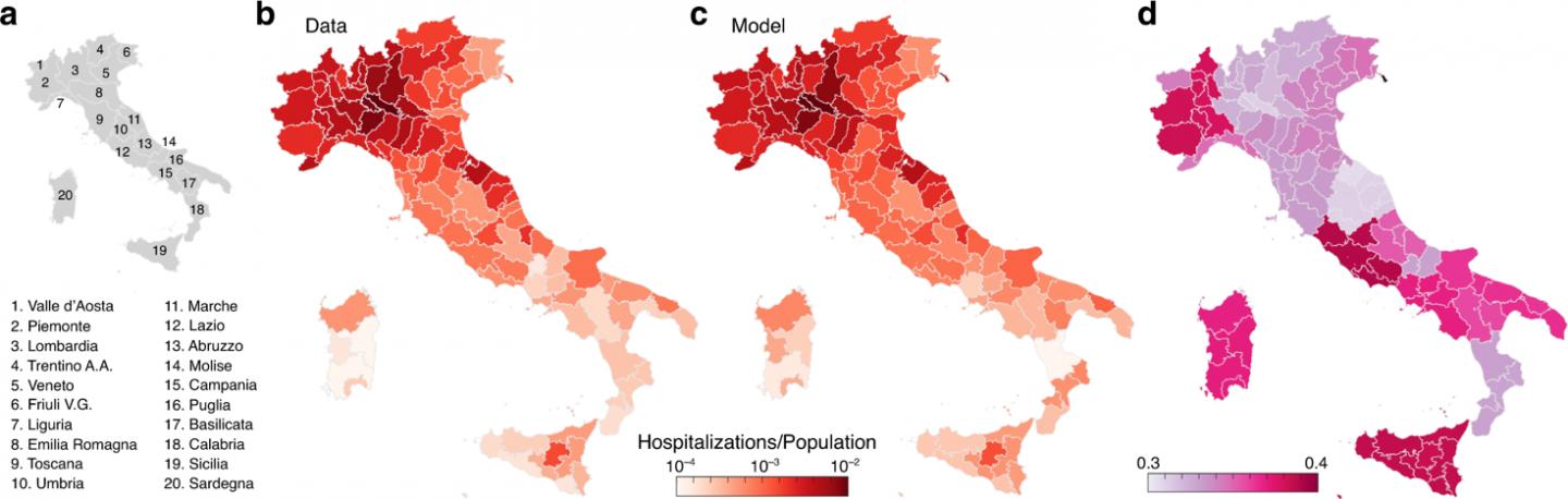 image: The comparative analysis of data and model results for hospitalizations in 107 Italian provinces as of May 1, 2020 is supported by: a a sketch of the Italian regions; b, c the prevalence of cumulative hospitalizations in each Italian province up to May 1, reconstructed data (b) and model simulations (c); d ratio between the estimated transmission rate on May 1, and the one estimated at the beginning of the outbreak (February 24).