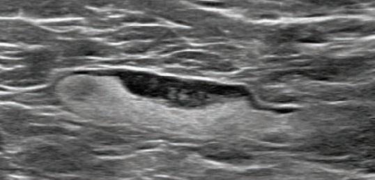 image: Screening mammogram and US demonstrated unilateral left axillary lymph node with cortical thickness of 5 mm on ultrasound (not shown). BI-RADS category 0 was assigned. Ultrasound from diagnostic work-up performed 7 days later showed no change in lymph node size. BI-RADS 3 was assigned.