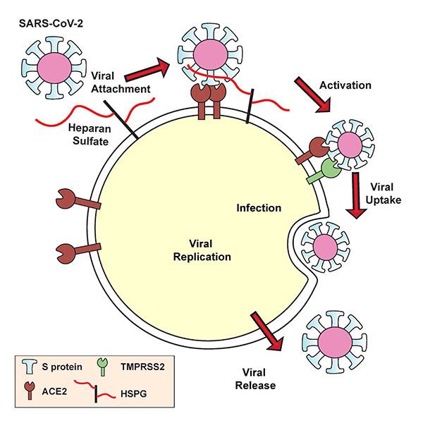 University of California San Diego School of Medicine researchers have discovered that SARS-CoV-2 can't grab onto ACE2 without a carbohydrate called heparan sulfate, which is also found on lung cell surfaces and acts as a co-receptor for viral entry.