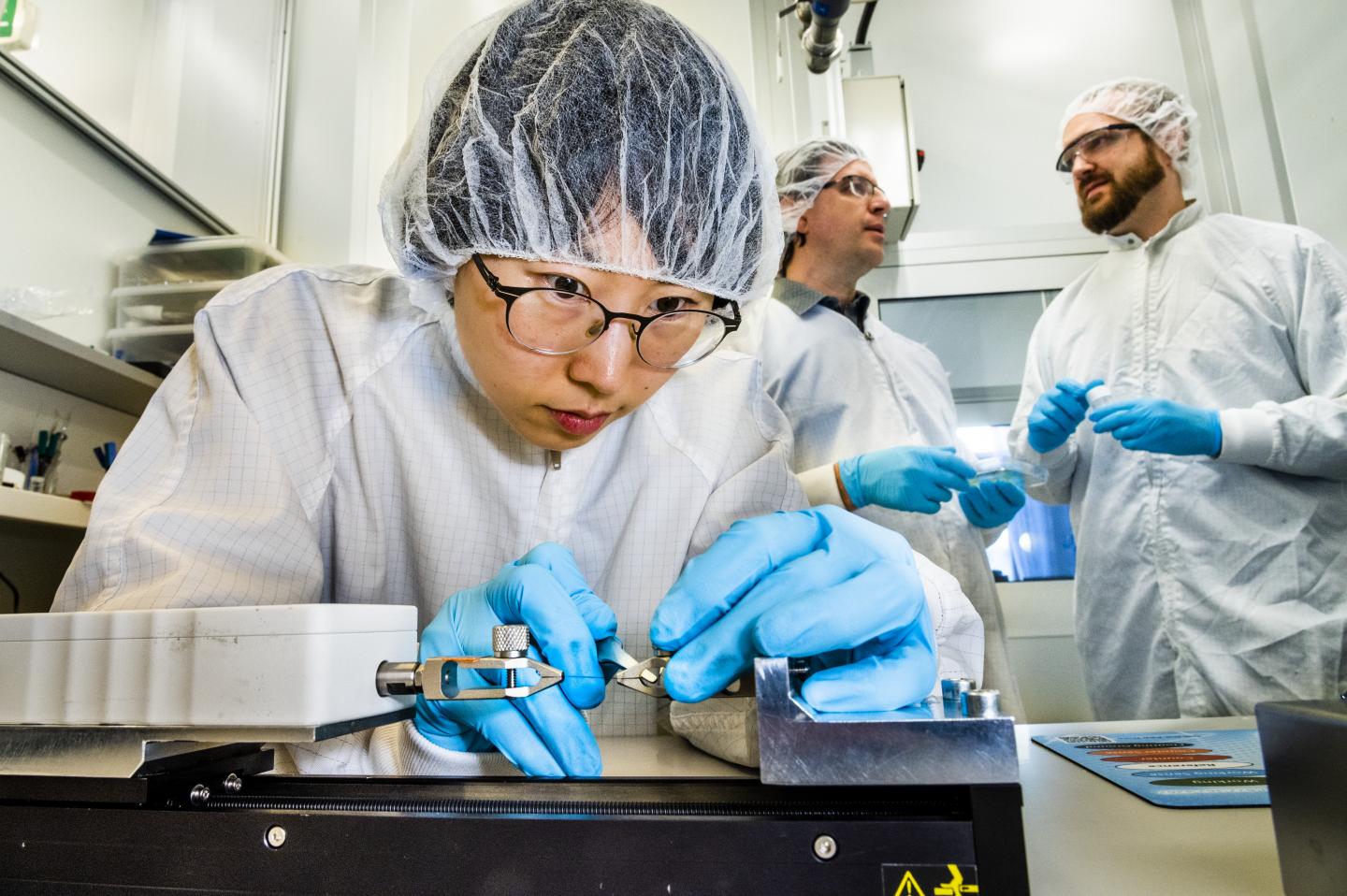 image: Nara Kim and in the background Xavier Crispin and Klas Tybrandt, Laboratory of organic electronics, Linkoping University.