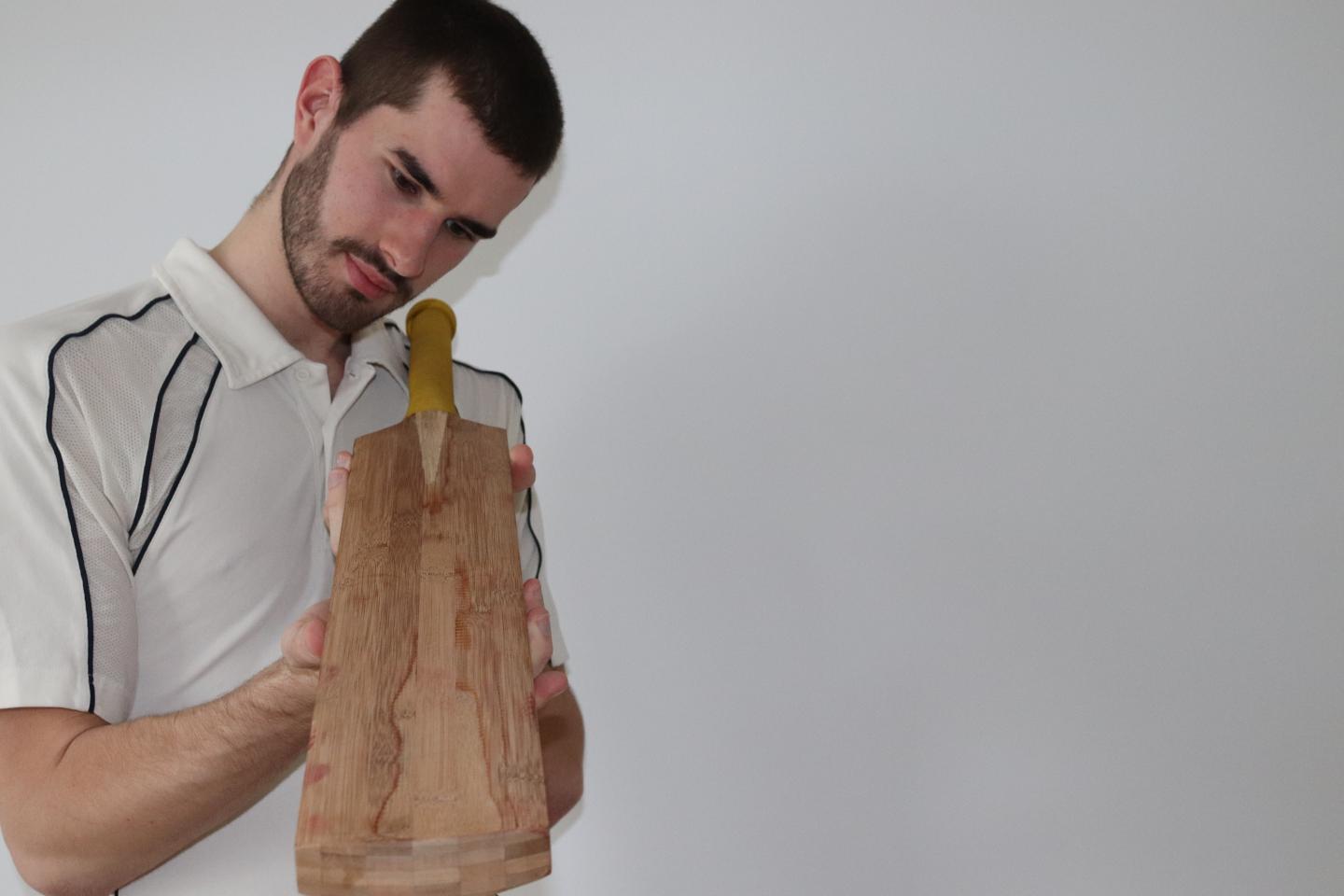 image: Co-author Ben Tinkler-Davies examines a prototype bamboo cricket bat