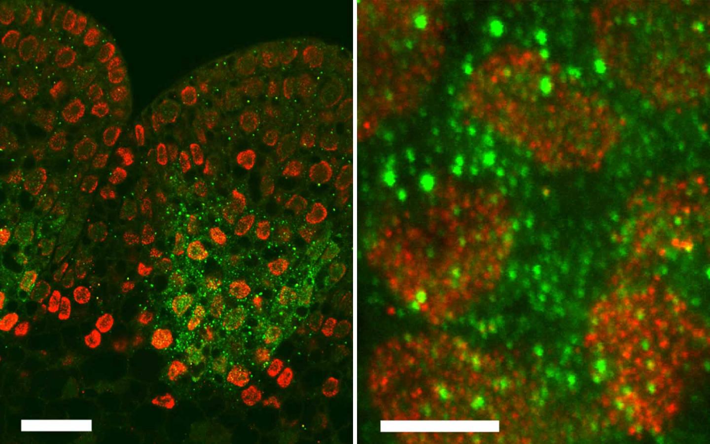 image: RA3 gene activity was detected and traced to presence in nucleus and cytoplasm of developing cell in maize ear. RA3 is in green and nuclei are counterstained in red.