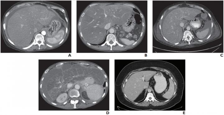 E, False-negative assessment in 56-year-old woman. CT image shows liver is not enlarged, heterogeneous, or low in attenuation, and ascites is not present. Both readers interpreted image as not showing findings indicative of NASH. However, NASH was diagnosed from surgical pathology.