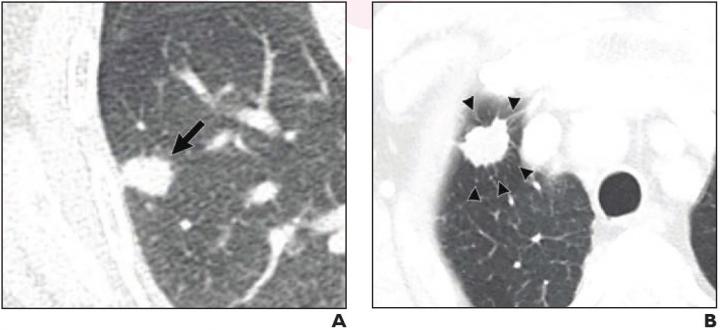 image: (A) 70-year-old woman with pulmonary adenocarcinoma who underwent sublobar resection without evidence for pLVI. 15-mm solid nodule with irregular margins present in right lower lobe (arrow). No tumor recurrence on 37-month follow-up. (B) 75-year-old man with pulmonary adenocarcinoma who underwent wedge resection that exhibited pLVI. 19-mm solid nodule with irregular margins and peritumoral interstitial thickening (arrowheads) present in right upper lobe. Ipsilateral mediastinal and hilar lymph node metastasis occurred after 5-month follow-up (not shown).