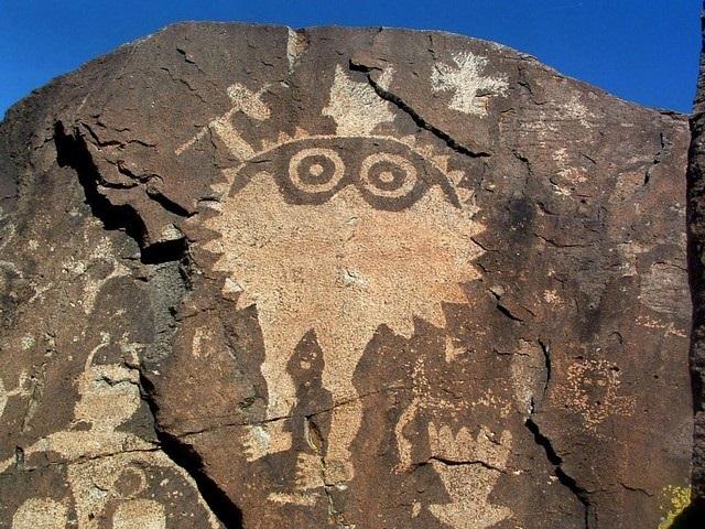 image:Â Petroglyph of two shield warriors appears high on a cliff on volcanic rock in the Galisteo Basin.