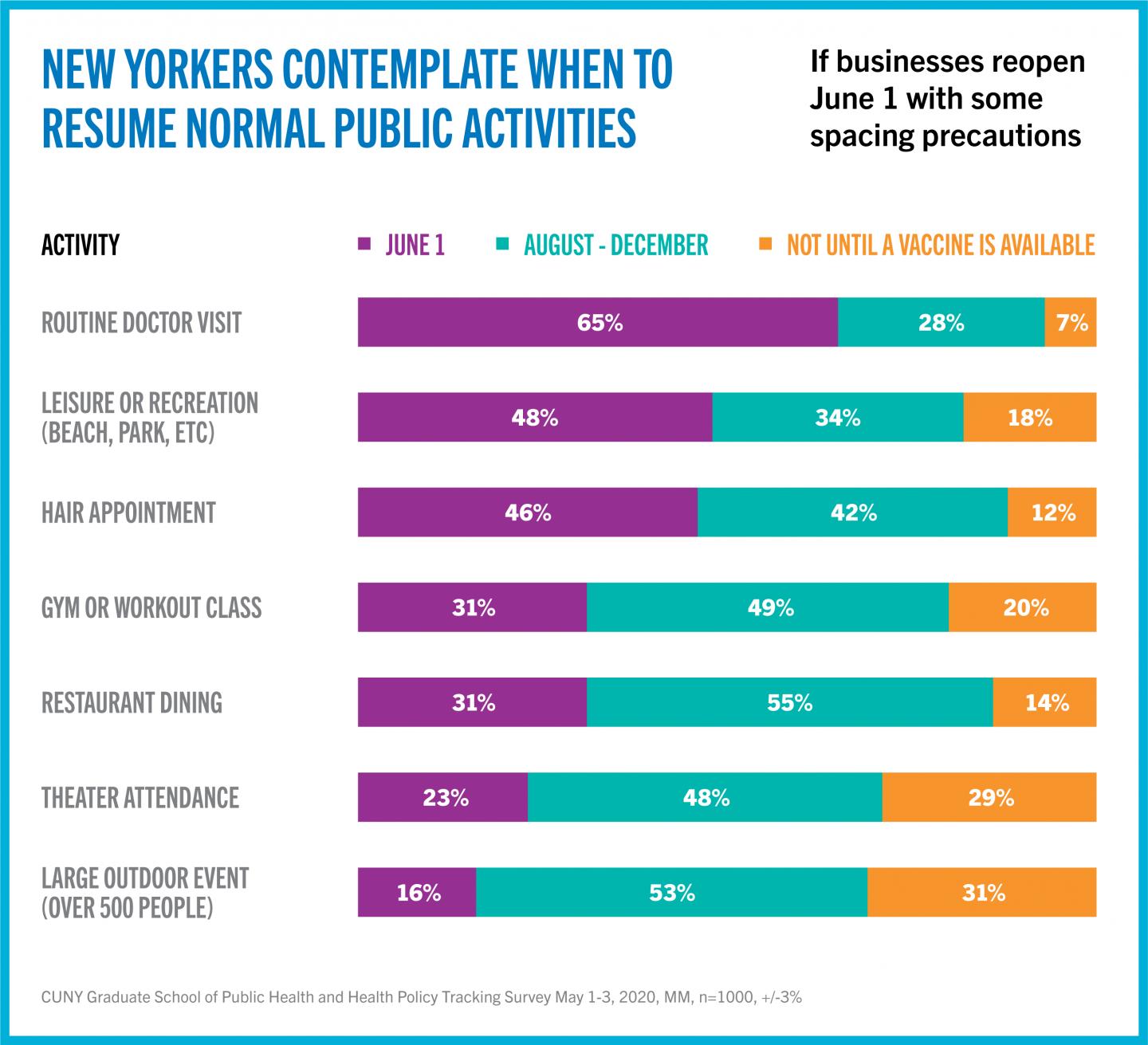 We asked New Yorkers how comfortable they would feel about participating in a number of activities if business reopened June 1st with some spacing precautions. Responses listed below indicate the desire of New Yorkers to prioritize certain activities they consider essential after June 1st.