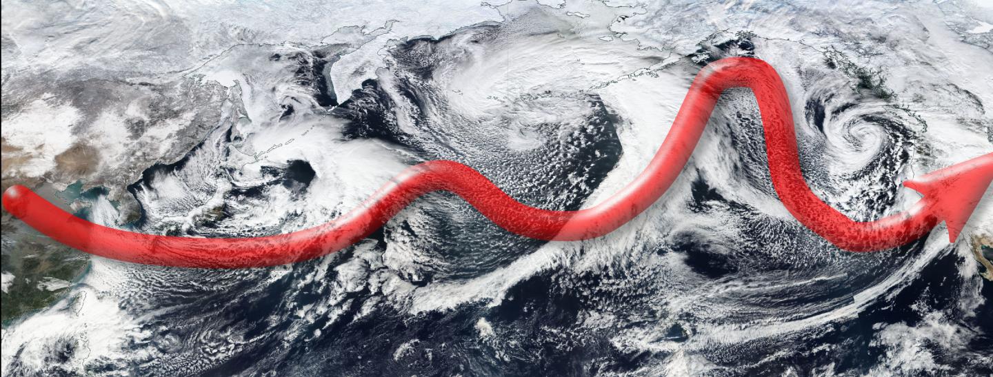 image: The northern westerly jet stream, indicated by the thick red arrow, is especially important in regulating the winter weather in the Northern Hemisphere.