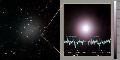 image: (Left) The ultra-diffuse galaxy is rich with globular clusters, which hold the key to understanding this mysterious object's origin and mass. (Right) A closer look at one of the globular clusters within the galaxy, which are all much brighter than typically seen, with the brightest emitting almost as much light as the brightest globular cluster within the Milky Way. The spectrum, obtained by Keck Observatory, shows the calcium absorption lines used to determine the velocity of this object. 10 clusters were observed, providing the information needed to determine the mass of the galaxy, revealing its lack of dark matter.