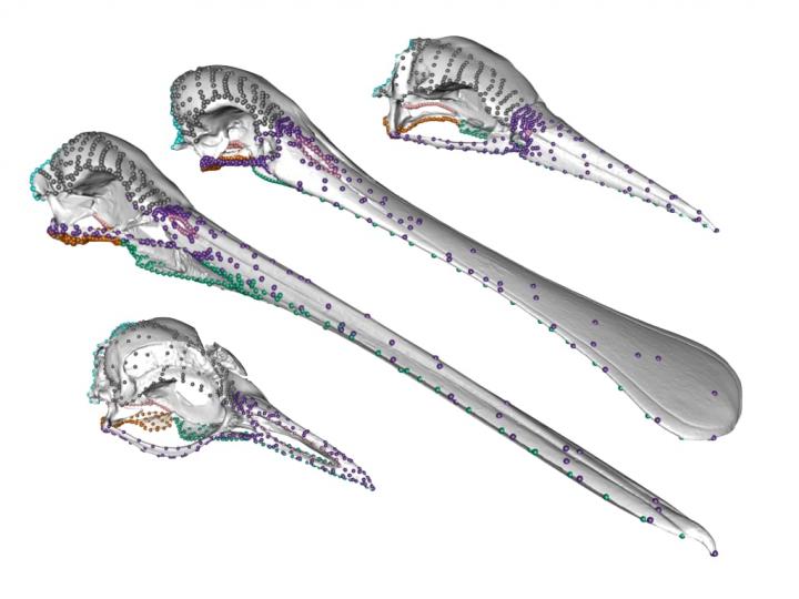 image: This shows the very different skull shape in four different bird species that all eat the same diet: aquatic animals. Despite eating similar diets, they acquire their prey in very different ways and have very different skull shapes. The colored dots on each skull are the 3D landmarks used to quantify skull shape, and each color represents a different sub region of the skull. From top to bottom, the northern gannet (Morus bassanus), Eurasian spoonbill (Platalea leucorodia), the brown pelican (Pelecanus occidentalis), and the Adélie penguin (Pygoscelis adeliae).