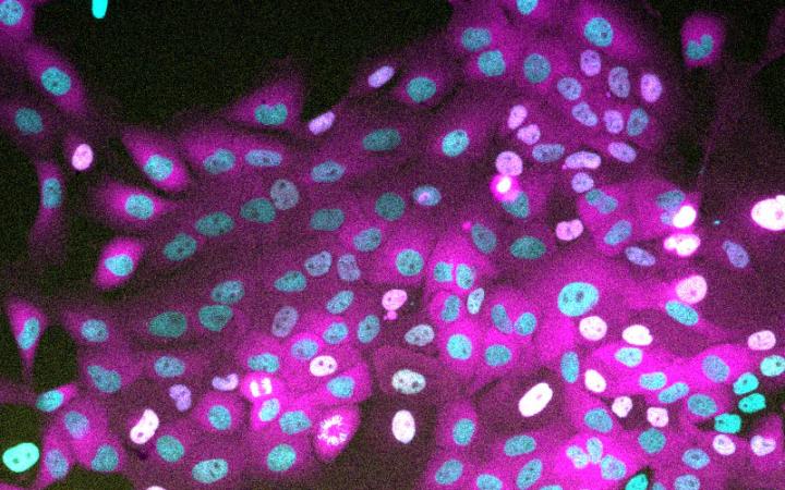 image: Cells expressing a nuclear marker (H2B) in cyan, a cell-cycle protein (Cyclin D1) in yellow and a proliferation marker (CDK2 activity sensor) in magenta.