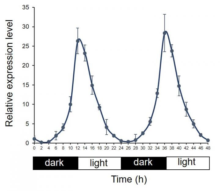 image: The leaf blade of rice seedlings was sampled every 2 hours for 2 days. Expression of the OsMGT3 gene relative to 0 hours is shown.