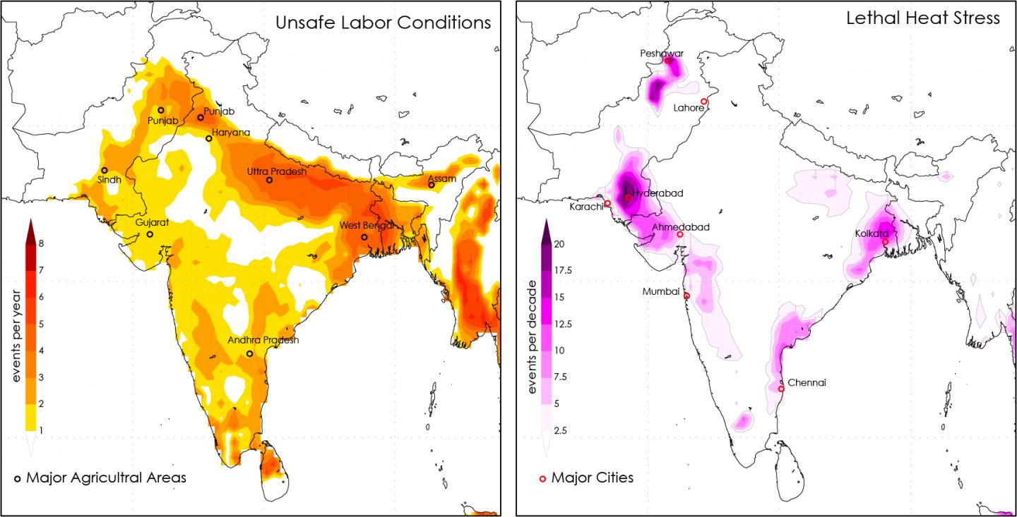 image: With 2 degrees Celsius of warming, the population of South Asia will experience more than double the exposure to unsafe labor temperatures (left) and will have almost three times the exposure to temperatures that cause lethal heat stress (right).