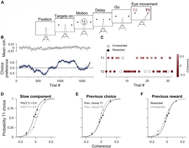 The authors found that primate developed two types of bias: a "slow" tendency to indicate right (or left) that lasted several minutes, despite not having any net tendency in the set of stimuli used, and a "fast" tendency that lasted scarcely a few seconds, resulting from the actions had just been made in the previous decision.