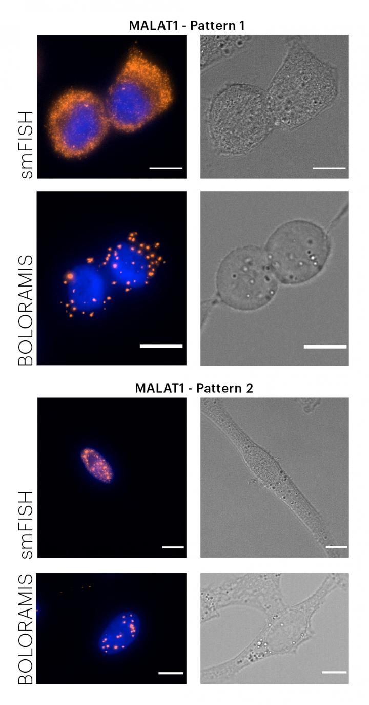 image: The researchers compared the BOLORAMIS method with single-molecule FISH (smFISH) analysis, a common standard for RNA localization studies, by tracing the location of a long non-coding RNA molecule known as MALAT1. Whereas, smFISH analysis detects MALAT1 in a rather diffuse pattern, BOLORAMIS resolves individual MALAT1 sites in the cells (orange in the left images) as small punctae, and shows that the RNA shuttle between the cytoplasm (top) and nucleus (bottom) in cells. The nuclei are stained blue in all fluorescent images on the left, while the images on the right show where in cells' overall structures MALAT1 resides.
