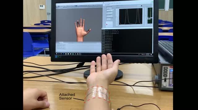 video: A deep-learning powered single-strained electronic skin sensor can capture human motion from a distance. The single strain sensor placed on the wrist decodes complex five-finger motions in real time with a virtual 3D hand that mirrors the original motions. The deep neural network boosted by rapid situation learning (RSL) ensures stable operation regardless of its position on the surface of the skin.