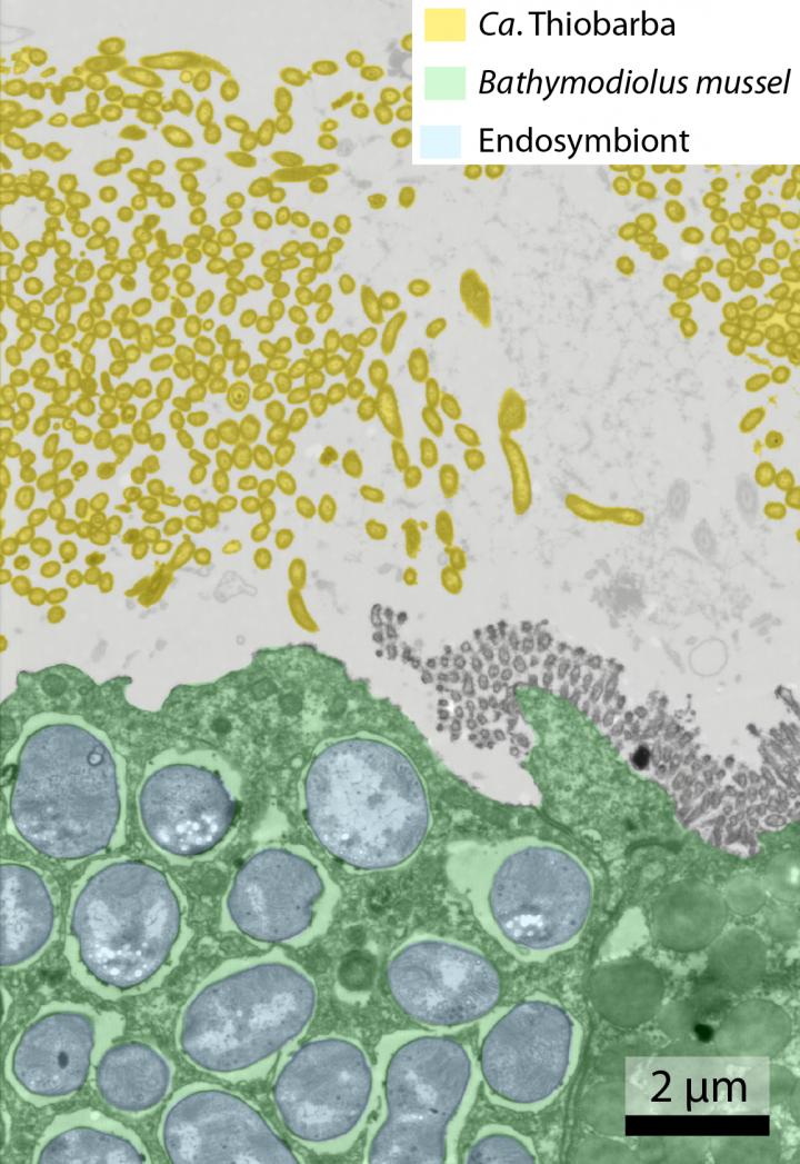 image: This is a colored image from a transmission electron microscope; Bathymodiolus tissue in green; cells of Ca. Thiobarba living outside the host cells in yellow. The typical endosymbiont of Bathymodiolus mussels is colored light blue.
