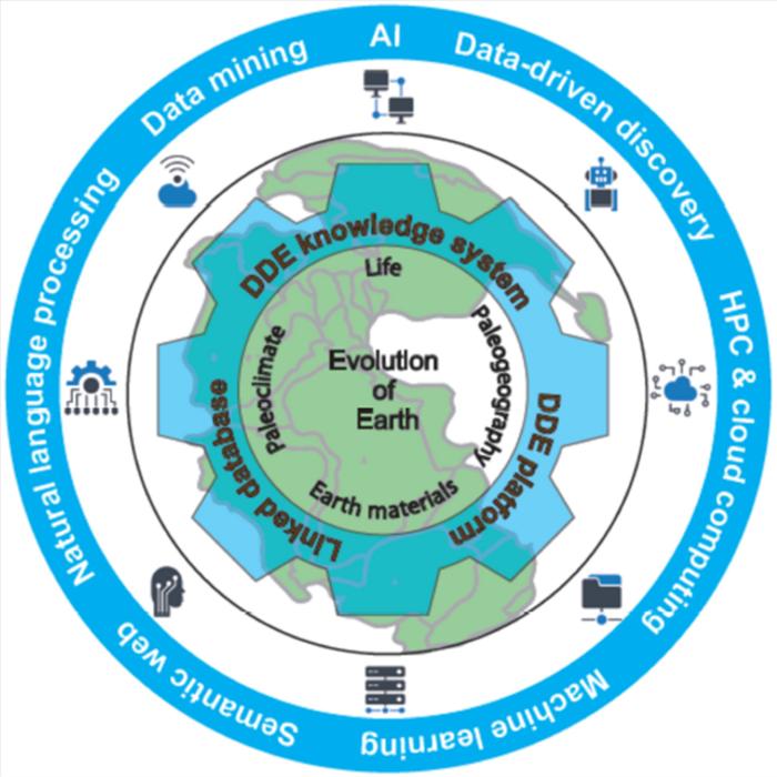 image: DDE aims to harmonize deep-time Earth data based on a knowledge system to investigate the evolution of Earth, including life, Earth materials, geography, and climate. Integrated methods include artificial intelligence (AI), high performance computing (HPC), cloud computing, semantic web, natural language processing, and other methods.