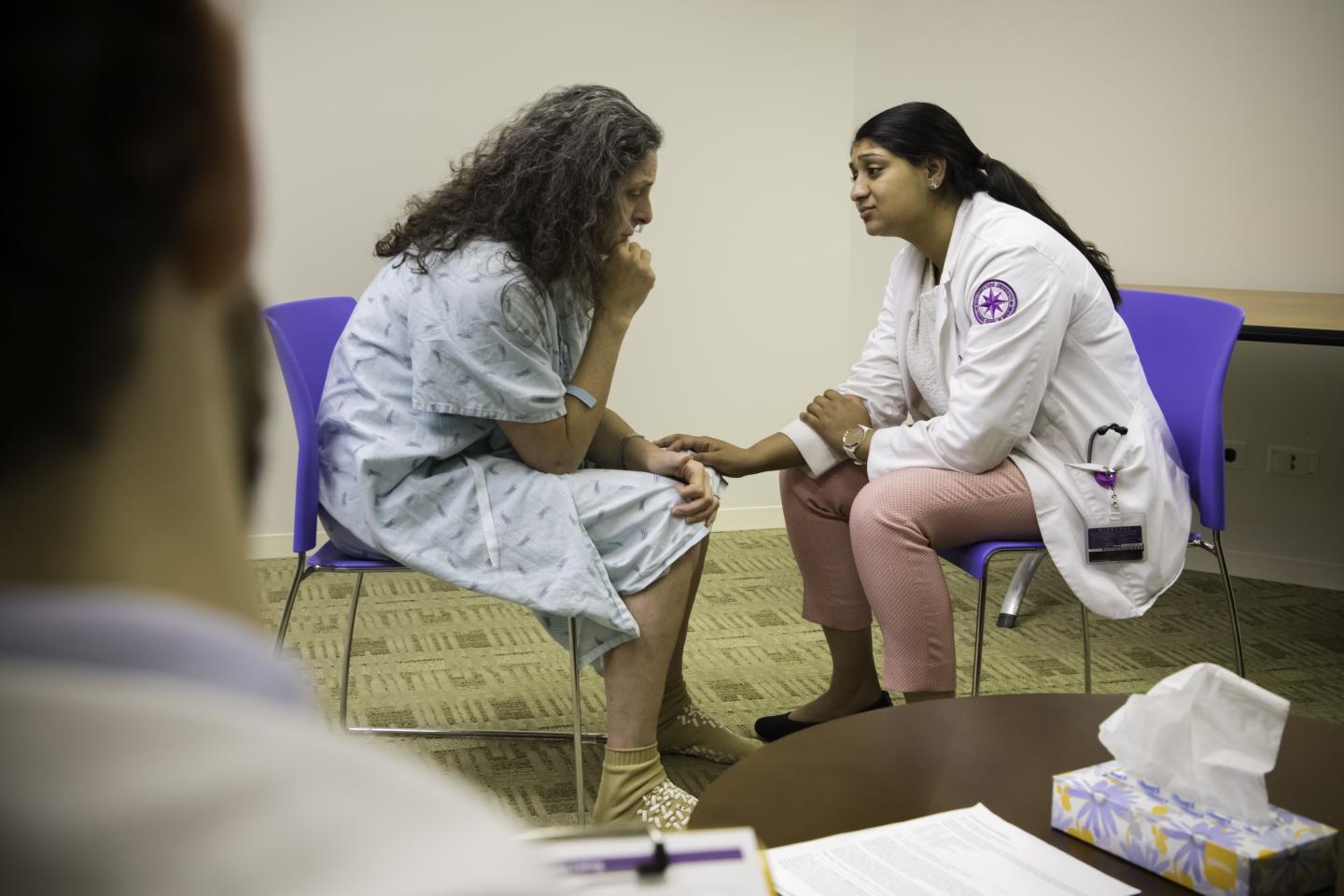 Medical students are instructed to base their conversations on a patient's response and needs. Sometimes a patient might need more information; other times, they just need a shoulder to cry on.