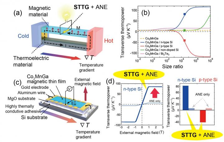 image: (a) Schematic diagram showing the concept of Seebeck-driven transverse thermoelectric generation (STTG). The charge current induced by the Seebeck effect in the thermoelectric material generates a large thermoelectric voltage in the magnetic material in the direction perpendicular to a temperature gradient. (b) Transverse thermoelectric voltage as a function of the size ratio between the thermoelectric and magnetic materials. The solid curves were calculated using our phenomenological models describing the STTG and the square symbols were measured in the experiments. (c) Schematic of the sample structure. (d) Comparison between the transverse thermopower for plain Co2MnGa, in which only the anomalous Nernst effect (ANE) appears, and the Co2MnGa-Si hybrid structure, in which both STTG and ANE appear simultaneously.
