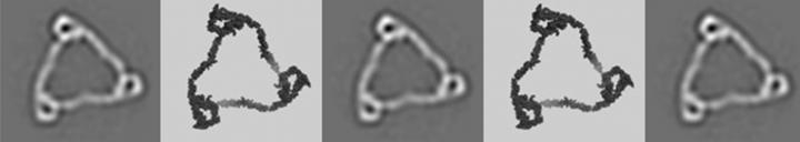 image: To describe the structure of properdin oligomers, the researchers used two independent techniques. In the panels with a dark background, the properdin molecule is seen as a light triangular molecule with an "eye" in each corner. This image was obtained by electron microscopy. The panels with a light background show the corresponding results obtained with small angle scattering. The results from the two independent techniques fit surprisingly well with each other.