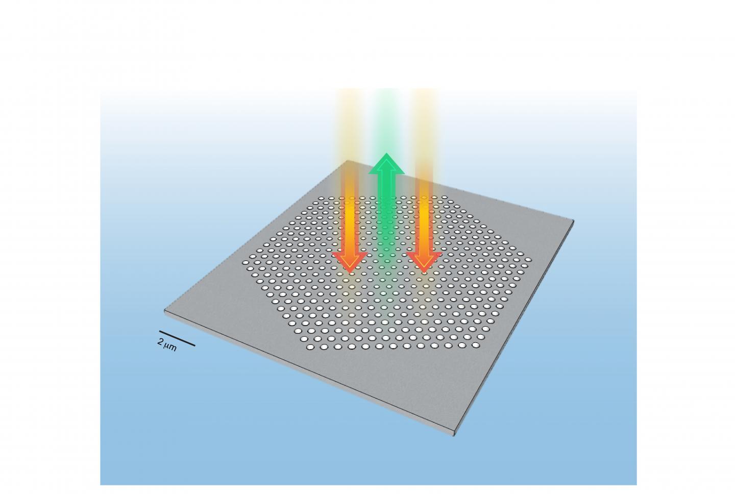 image: An illustration of the researchers’ design. The holes in this microscopic slab structure are arranged and resized in order to control and hold two wavelengths of light. The scale bar on this image is 2 micrometers, or two millionths of a meter.