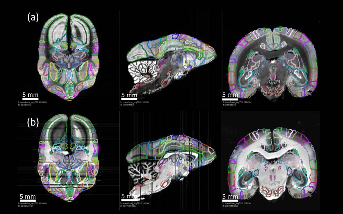 image: The Brain/MINDS atlas can be used in conjunction with other brain mapping and imaging methods. Here, mapped neural connections of interest (atlas annotations--colored) are laid on top of MRI scans (greyscale).