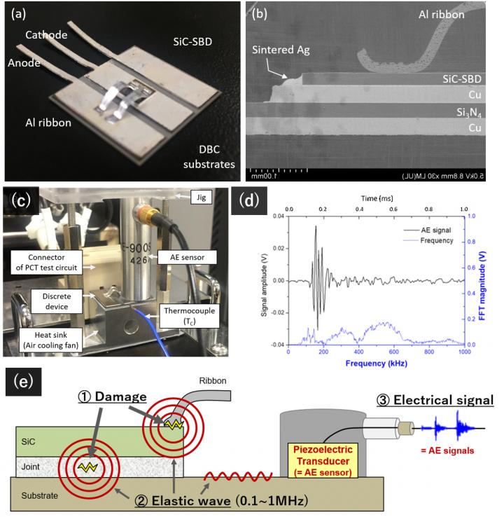 image: Acoustic emission (AE) was applied to monitor wear-out failure in discrete SiC Schottky barrier diode (SBD) devices with a Ag sinter die attachment, to successfully monitor the real-time progress of failure of Al ribbons for the first time. (a) Optical image of a SiC-SBD device. (b) Cross-sectional SEM image. (c) Experimental apparatus for power cycling tests and real-time AE monitoring. (d) Waveform of collected AE signal and its characteristic, including counts and amplitude. (e) Generation, propagation, and collection of AE signals (i.e., elastic waves) in power electronics during a power cycling test.