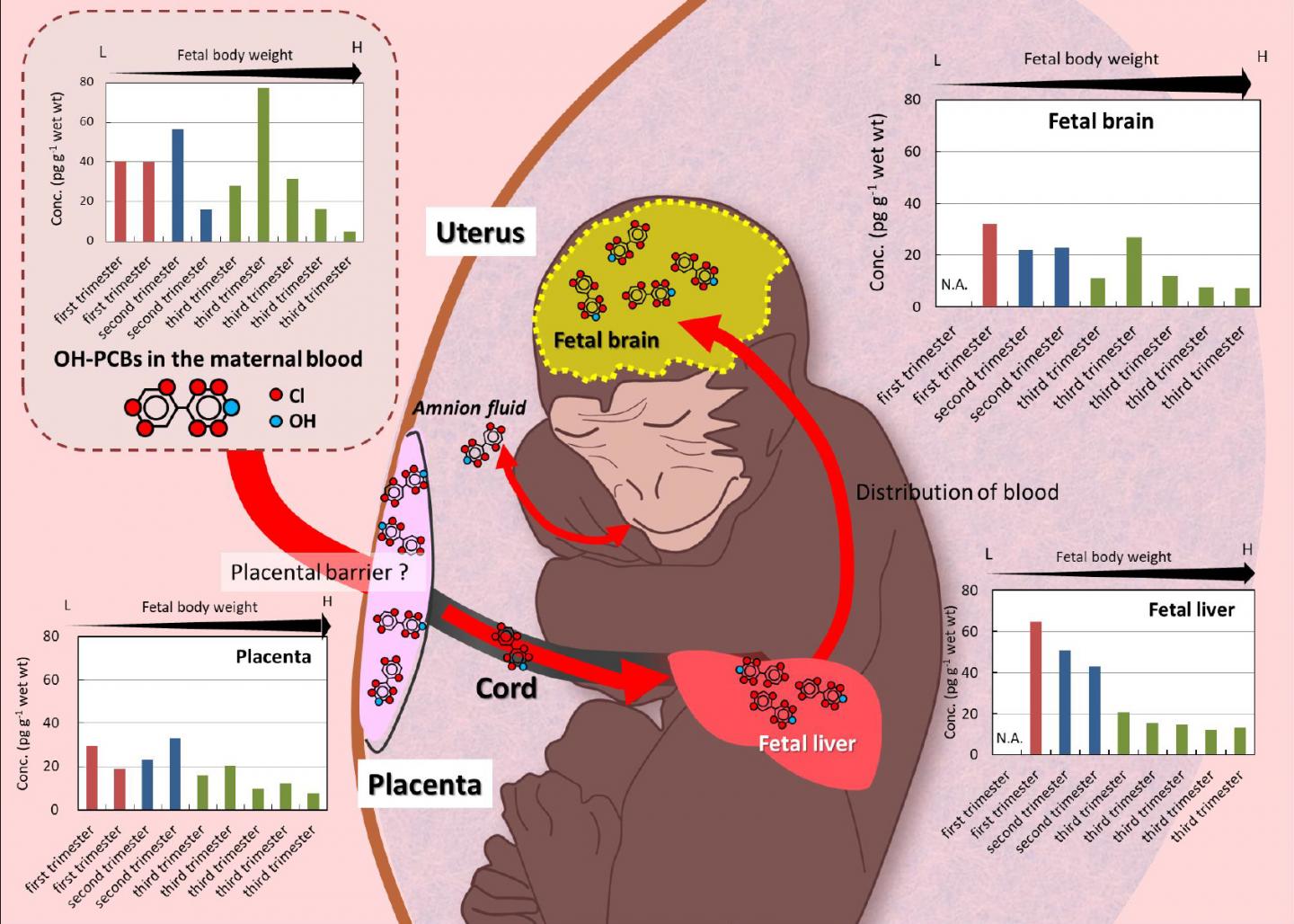Hydroxylated polychlorinated biphenyls (OH-PCBs) are metabolites of PCBs and known endocrine disruptors in humans. Of particular concern regarding this kind of effect has been the disruption of the thyroid hormone homeostasis by OH-PCBs. Some OH-PCB congeners are involved in disrupting TH transport by competitive binding to the thyroid hormone transport protein, transthyretin (TTR) in mammalian blood. Prenatal OH-PCBs exposure may disrupt fetal brain development during the critical period of thyroid hormone action. Congenital hypothyroidism causes cretinism and mental retardation, and an insufficient thyroid hormone signaling has been suggested as one of the causes of attention deficit/hyper activity disorder (ADHD). However, there have been limited studies on the OH-PCBs transfer to the fetal brain, particularly in primates.