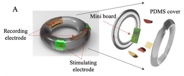 image: 3D conceptual drawing for the ring-shaped electrode with stimulating, recording electrodes, and pre-amplifier