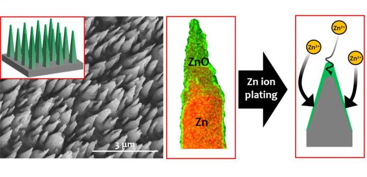 image: Dendrite-free "functionalized ZnO layer" coated on a Zn hexagonal pyramid core.