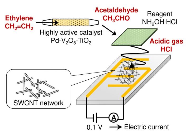 In this research project, we developed a small, highly sensitive sensor capable of detecting ethylene with great selectivity. This sensor consists of three components: a highly active catalyst that selectively converts ethylene into acetaldehyde, a reagent that reacts with acetaldehyde to release acidic gas and an SWCNT (single-walled carbon nanotube) electrode which is very sensitive to acidic gas (figure). This highly active catalyst can repeatedly convert ethylene into acetaldehyde as analyte-air passes through it. In addition, the catalyst can operate at near room temperature (40 ℃), making the small sensor energy efficient. The acidic gas produced by the reaction between acetaldehyde and the reagent strongly withdraws electrons from the SWCNT semiconductor, changing the semiconductor's electrical resistance. These characteristics and mechanisms enable the sensor to selectively and sensitively detect ethylene even at an extremely low concentration (0.1 ppm) by monitoring changes in electrical resistance. This sensor is expected to be effective in monitoring ethylene concentrations for many types of fresh produce in storage. For example, the ethylene concentrations that promote ripening in bananas and kiwifruit are approximately 500 ppm and 10 ppm, respectively: well within the sensor's useful sensitivity range.