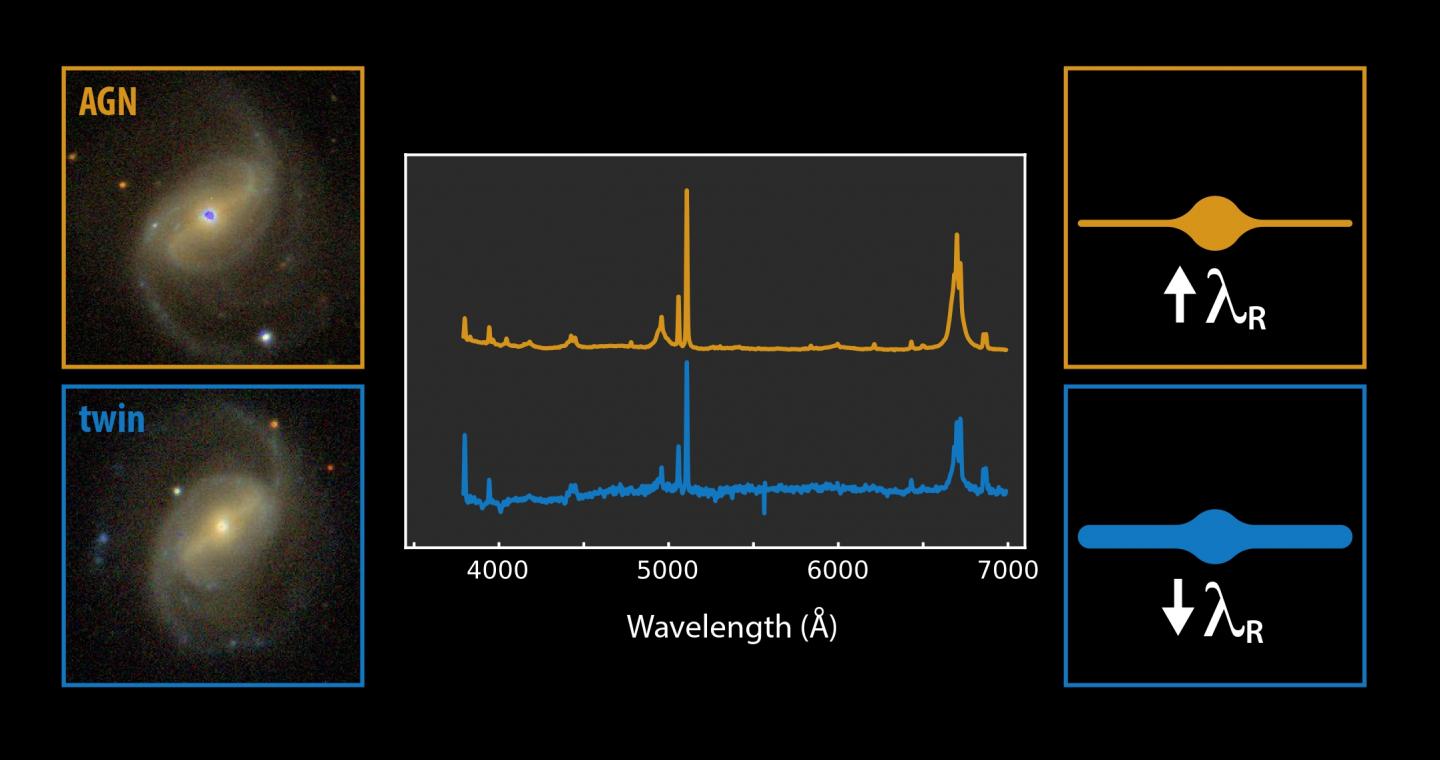 image: Image illustrating the comparison between an active spiral galaxy (orange box) and its non-active twin (blue box)