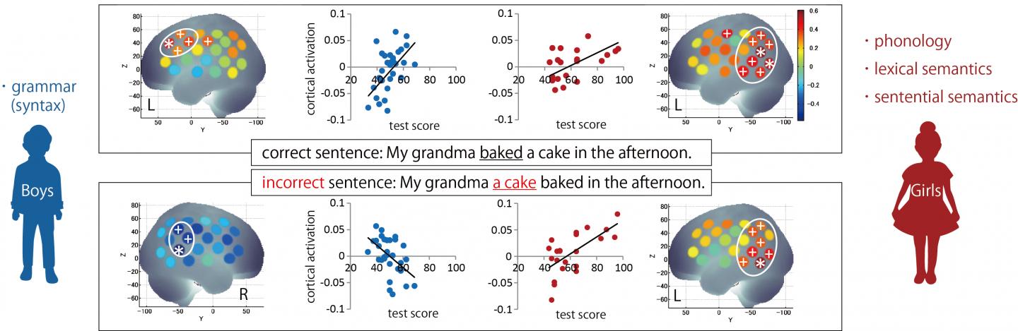 The boys and girls were given a standardized English test and a test of "Working Memory", a temporary storage in the brain used to organize, manipulate and analyze newly arrived information. They then listened to English sentences, including some with grammatical errors; observations of brain activity were taken using functional near-infrared spectroscopy (fNIRS) and event-related potential (ERP) measurements. fNIRS tells us which parts of the brain are active; ERP gives us an idea of how brain activity varies with time.