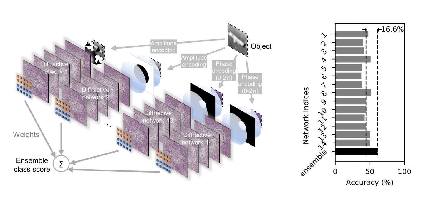 image: (Left) A D2NN ensemble, constituting 14 individual diffractive networks that have different types of filters placed between the object plane and the first diffractive layer. The ensemble class score comes from a weighted summation of the class scores obtained from individual D2NNs. (Right) The ensemble classification accuracy is 16.6% higher than the average classification accuracy of the constituent D2NNs.