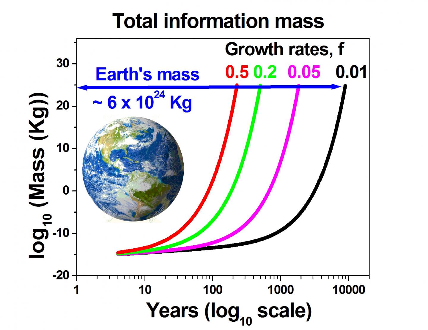 It would be approximately 130 years until the power needed to sustain digital information creation would equal all the power currently produced on planet Earth, and by 2245, half of Earth's mass would be converted to digital information mass.