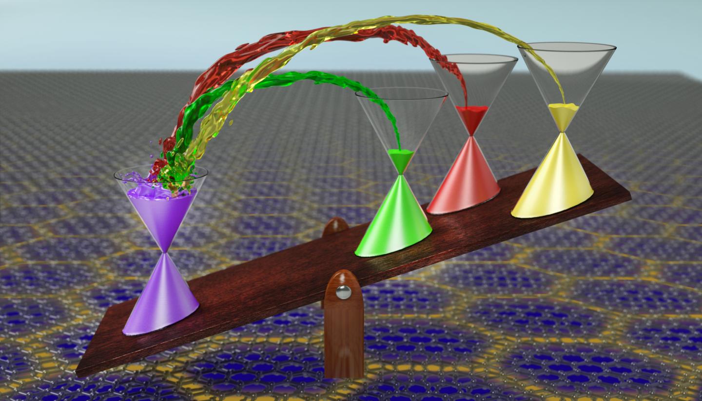 "Left with no electrons, the three remaining flavours need to start refilling again from scratch. They do so until another phase transition occurs, where this time one of the remaining three flavours grabs all the carriers from its peers, pushing them back to square one. Electrons thus need to climb a mountain like Sisyphus, being constantly pushed back to the starting point in which they revert to the behavior of light Dirac electrons," says Rozen. While this system is in a highly symmetric state at low carrier fillings, in which all the electronic flavours are equally populated, with further filling it experiences a cascade of symmetry-breaking phase transitions that repeatedly reduce its symmetry.