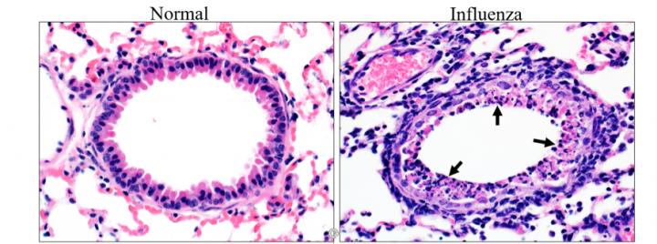 image: Lung airways from healthy (left) and influenza infected (right) mice. Arrows show where the epithelial cells lining the airways (pink) have been sloughed off in the infected.