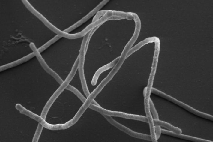 image: Scanning electron micrograph of the bacterium Meiothermus ruber.