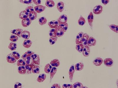 image: These are images of human eosinophils, isolated from the blood. The red stain shows the packages of inflammatory substances that these cells store and release in eosinophilic esophagitis