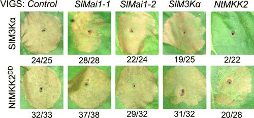image: Mai1 acts upstream of M3Kα and MKK2. Representative photographs of the cell death observed 5 days postagroinfiltration of the cell death elicitors SlM3Kα or constitutive-active NtMKK2DD into N. benthamiana leaves that were silenced using the indicated VIGS constructs.