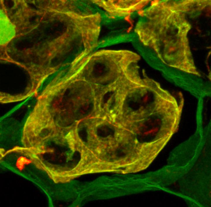 image: Colocalisation of anti-Vicilin antibody (red) with amyloid-specific dye Thioflavin T (green) on cryosections of pea seeds. Colocalisation is shown in yellow. Source:
