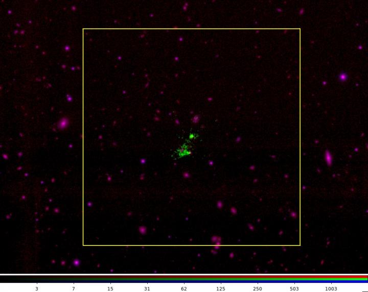 image: Three-color image of the sky around Lyman-alpha blob 6 (LAB-6). In green is the Lyman-alpha emission from LAB-6. LAB-6 is 18.5 billion light years away from us in the direction of constellation Grus, with an extension about half million light years . The physical size of the yellow box is 3.26 million light years. Most galaxies seen in this image are foreground galaxies. (Blue: VLT/Hawk-I J band at 1.258 micron; Red: VLT/Hawk-I Ks band at 2.146 micron; Green: Lyman-alpha emission at 0.411 micron with Blanco 4m telescope at the Cerro Tololo Inter-American Observatory)